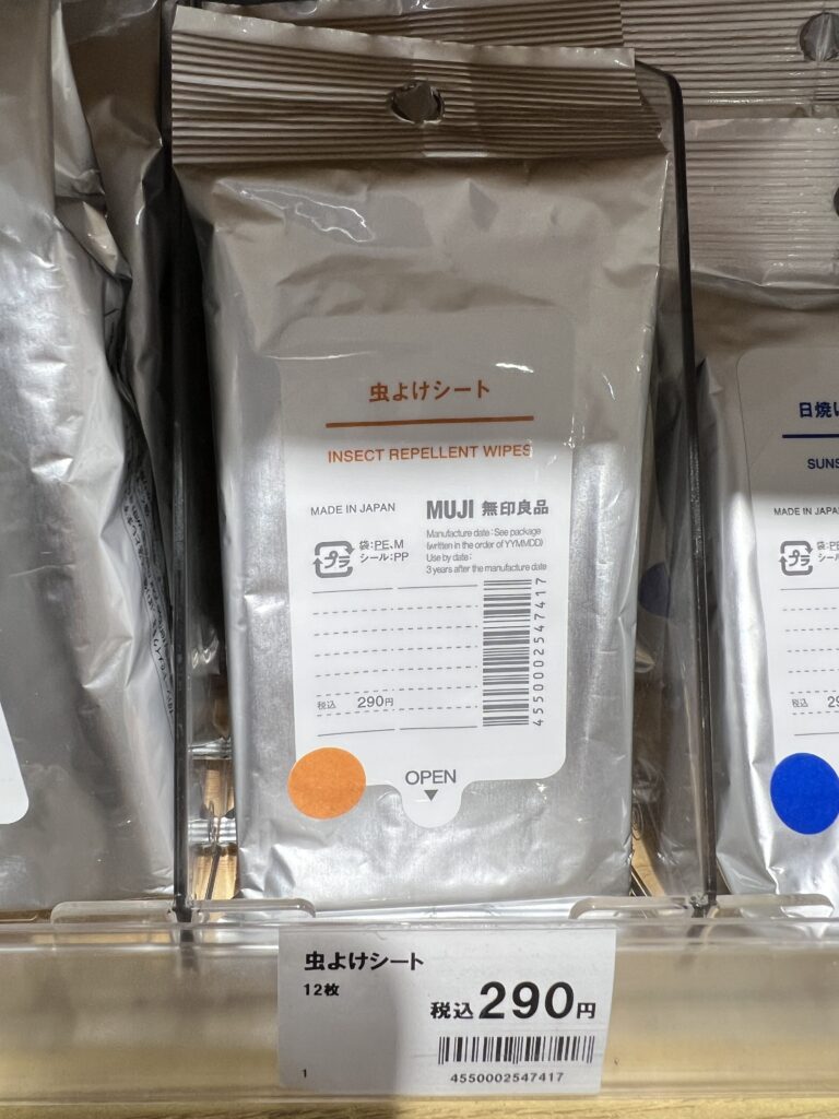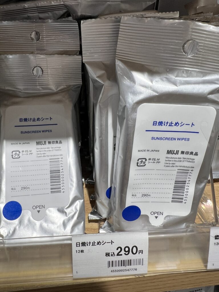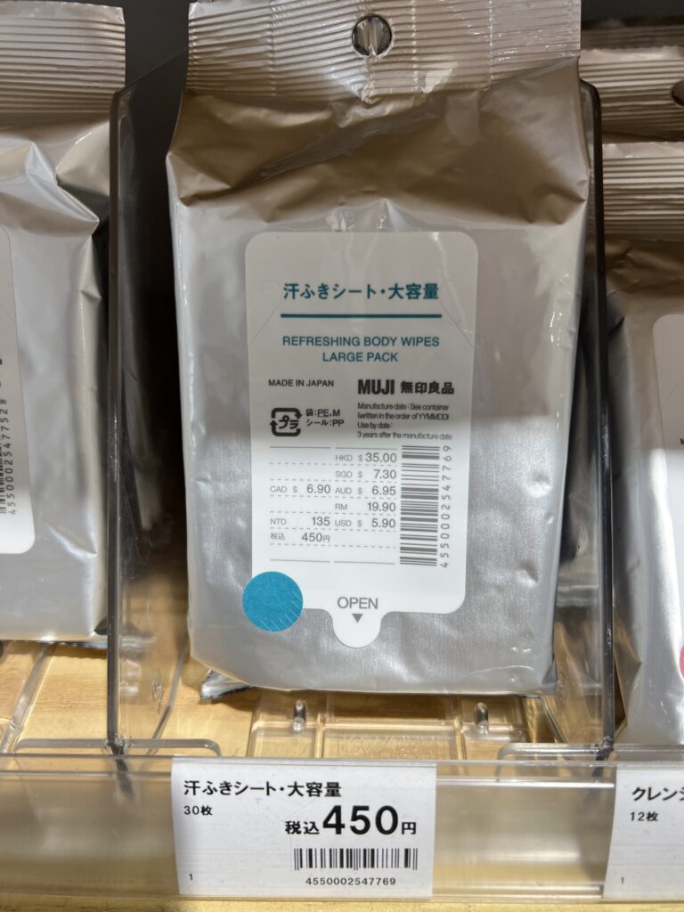 無印良品的濕紙巾系列是來東京旅行時的必備品!從防曬濕巾防蚊濕巾,還有清爽的身體擦拭巾,這些實用的小物能在旅途中隨時保護您的肌膚,讓您保持清爽舒適。每一款產品設計簡單實用,價格也非常親民,是短期旅行中的理想選擇。