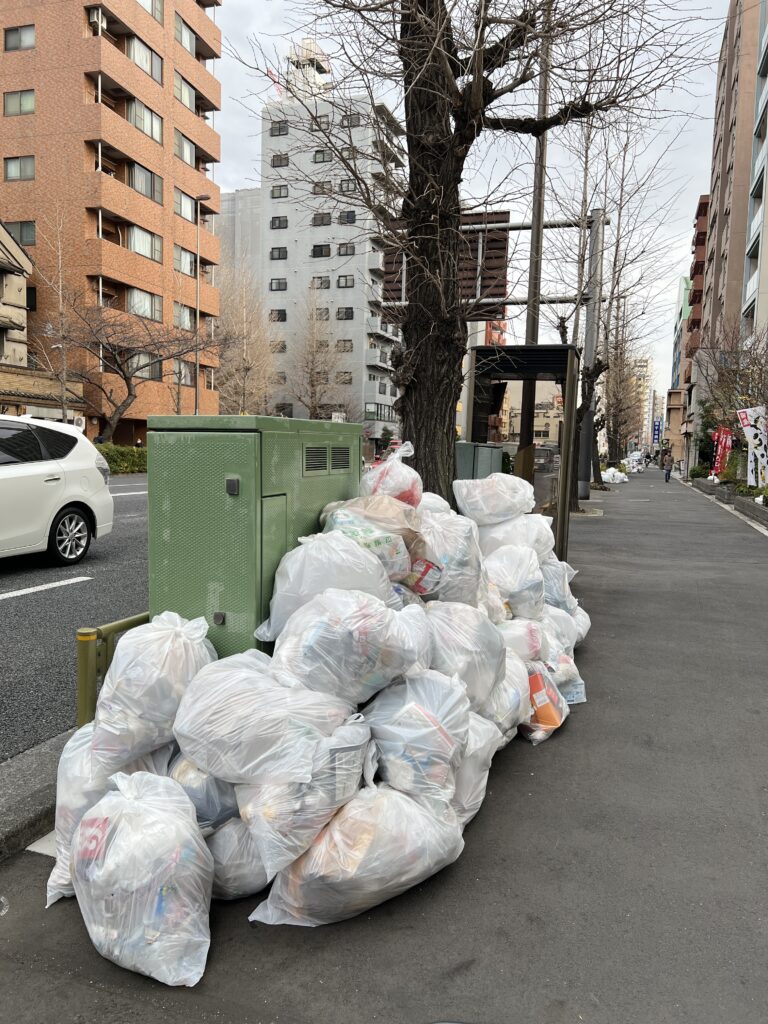 新年期間,由於垃圾回收業者放假,東京街道上堆積了超過一週的垃圾。然而,讓人驚訝的是,即使面對這樣的情況,每戶人家都將垃圾分類整理,用透明袋裝好,整齊地堆放在街道的指定位置,完全沒有散落或不堪的場景。這份秩序感令人欽佩!