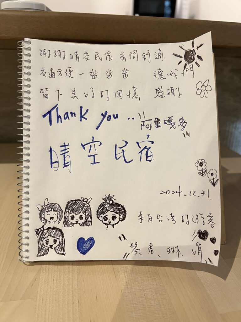 感謝琴、東、琳、晴四位來自台灣的可愛朋友,特地在晴空民宿留下這麼用心的手寫留言,讓我們深感驕傲與感動!💖