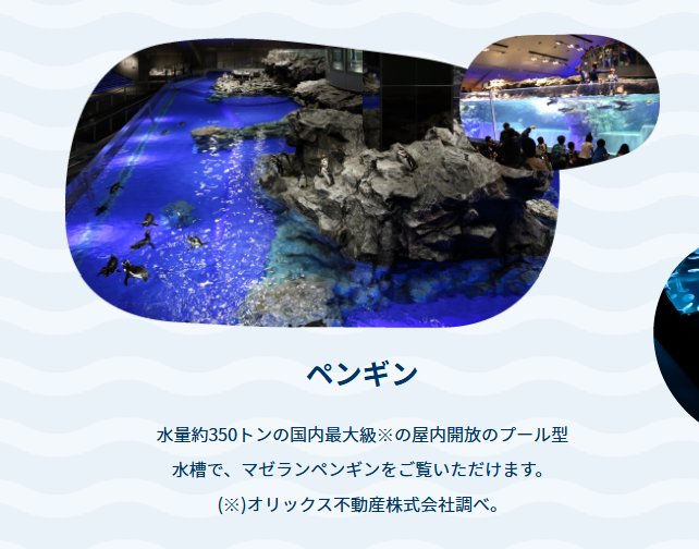 🐧 企鵝水槽 —— 擁有日本最大規模的室內開放型水池,350噸水量的空間內,可以觀賞可愛的馬哲蘭企鵝悠游其中!