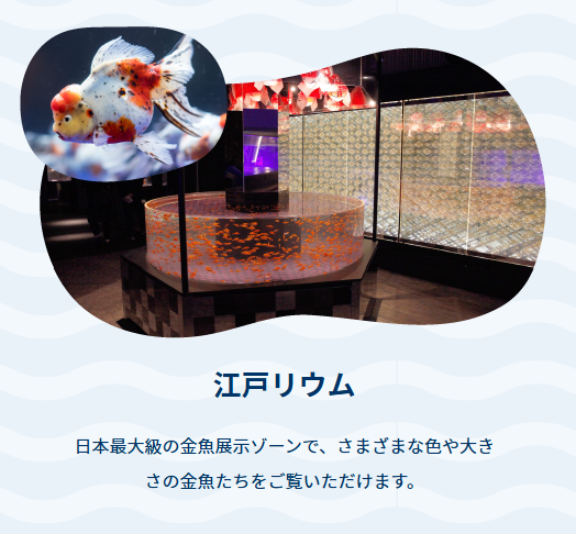 🏮 江戶金魚區 —— 日本最大規模的金魚展示區,各種色彩繽紛的金魚在水池內游動,美不勝收!