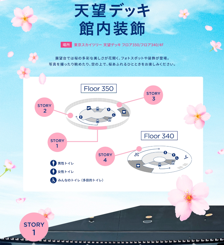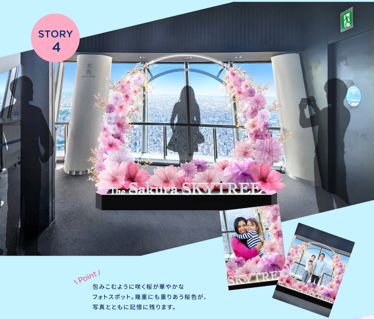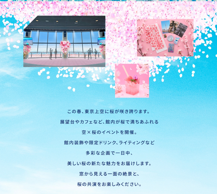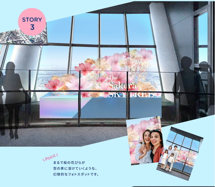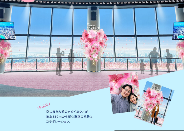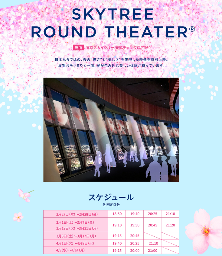 🌸 必看亮點 ✨ 350公尺高空 櫻花裝飾,體驗與東京櫻花共舞的浪漫 ✨ 限定櫻花甜點 & 飲品,讓您邊吃邊拍美照📸 ✨ 360° 環繞投影秀「SKYTREE ROUND THEATER」,沉浸式體驗櫻花盛開之美