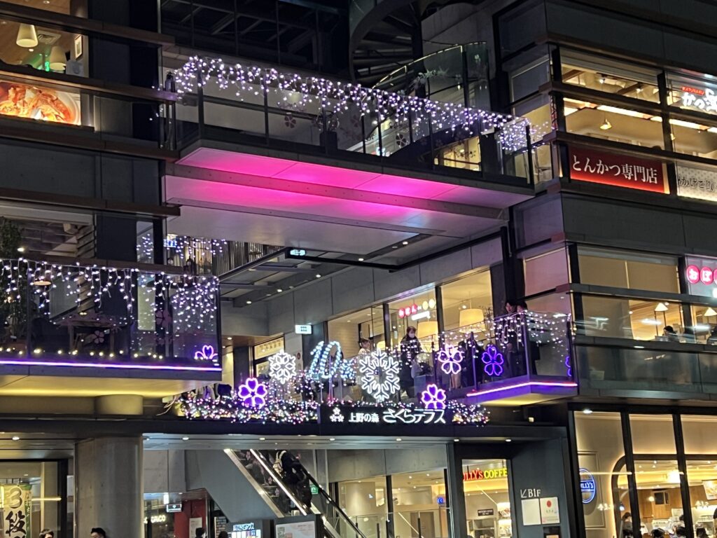 到了晚上,上野美食廣場會亮起 夢幻燈飾,粉色和紫色的燈光讓整個空間變得浪漫無比,特別適合約會、聚餐或與朋友一起拍美照打卡!