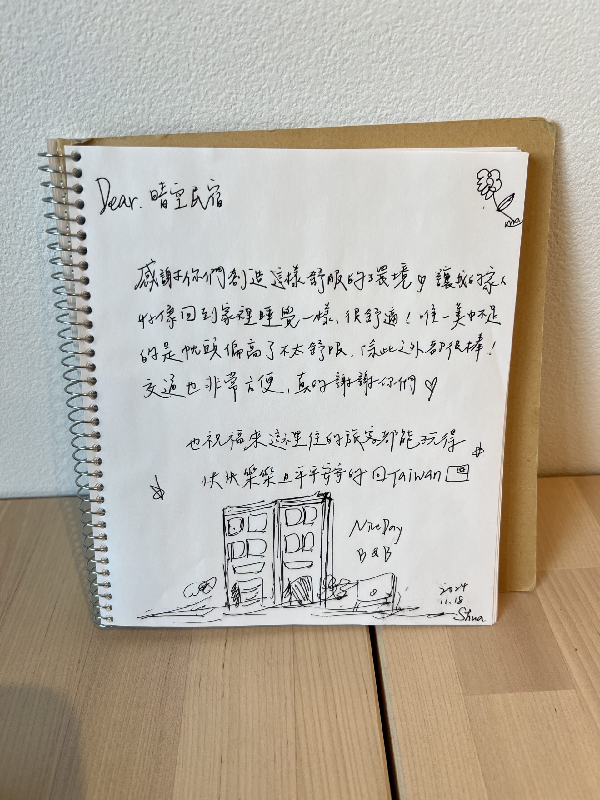 來自遠道而來的客人,在 東京晴空民宿 的留言本中留下了這篇暖心的手寫信,字裡行間充滿了感激與美好回憶!💌