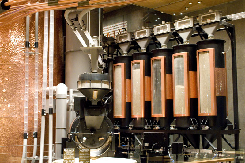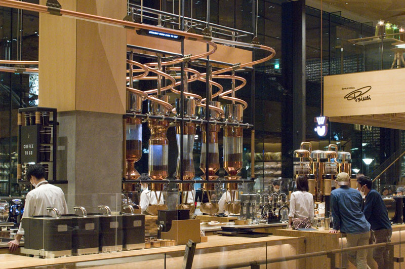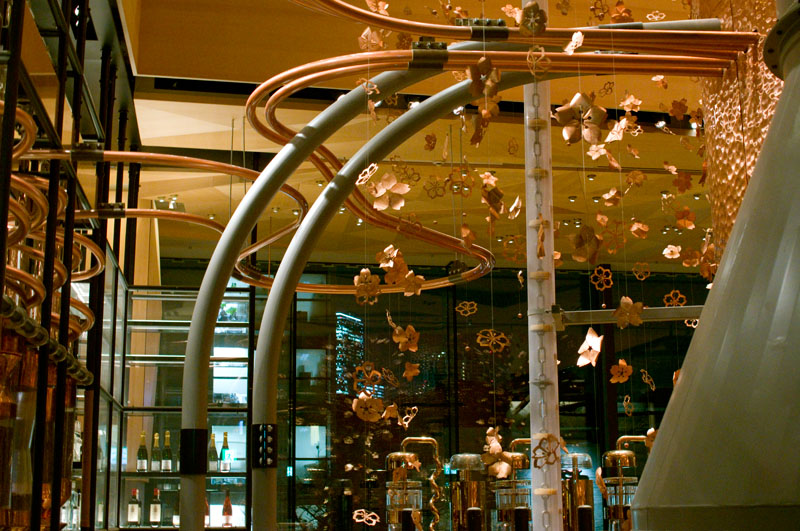中央的銅製烘焙桶直達四樓高,內含垂直烘焙設備,外觀以櫻花為主題手工雕刻,細節令人驚嘆。