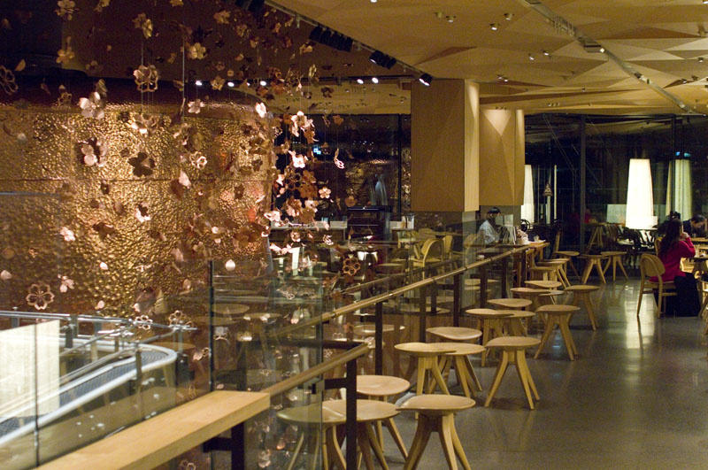 樓梯旁的Teacup Wall是以Teavana茶杯為靈感,由日本頂尖磁磚職人一片片手工打造而成。