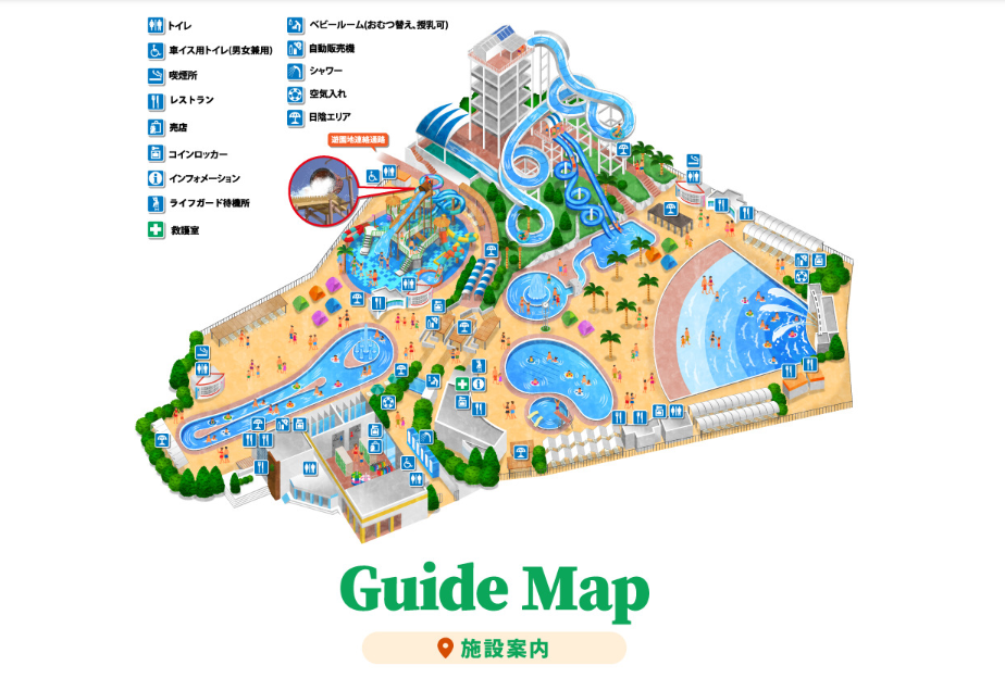 🗺 園區地圖清楚好逛,設施齊全,沖澡間、置物櫃、哺乳室、投幣機樣樣有