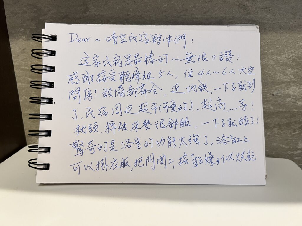 旅客們一開頭就給了我們「最棒的~無限讚!」的最高榮譽!他們提到:「感謝接待聽障團5人,住4人~6人大空間房!設備都齊全」。這代表無論您是家庭出遊,或是與三五好友相約東京6天5夜、東京7天6夜,東京晴空民宿都能提供您寬敞舒適的空間,並且所有設備一應俱全,讓您的住宿體驗毫無後顧之憂!