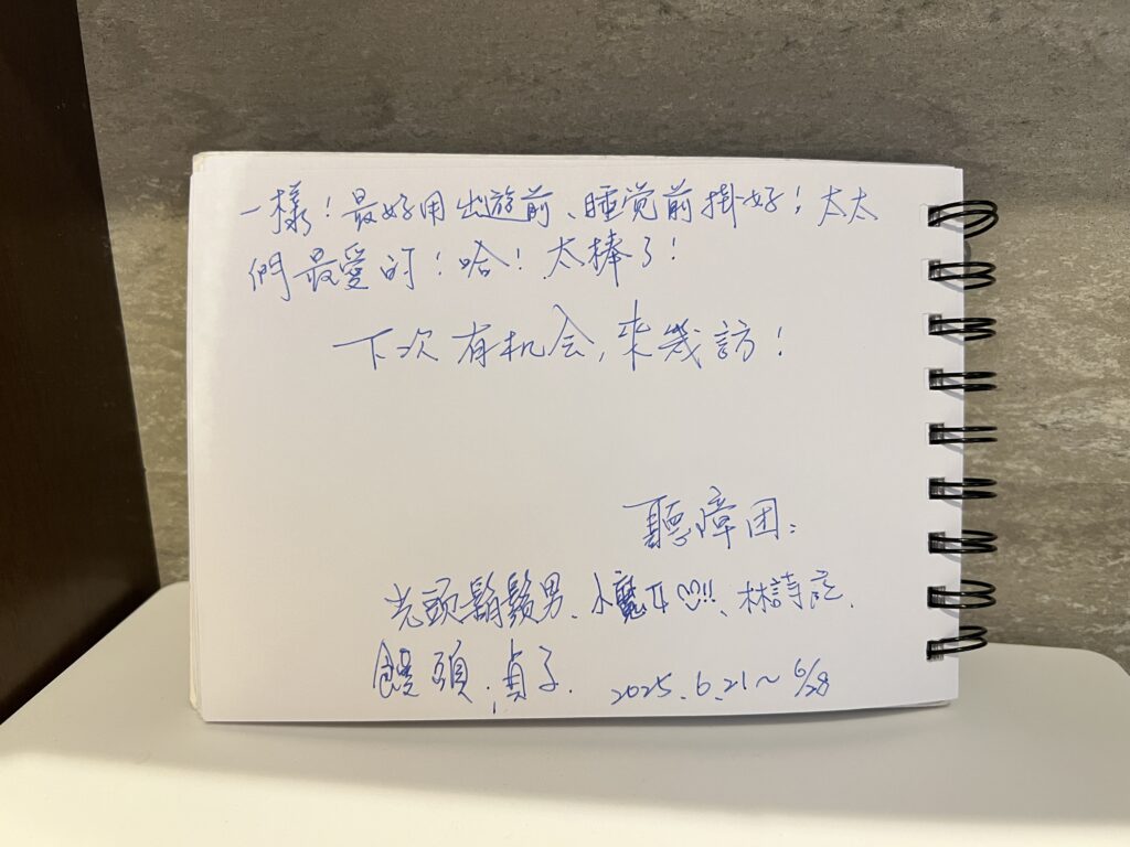 最終,旅客們帶著滿滿的感激與期待寫下:「下次有機會,再來拜訪!」這份來自「聽障團」旅客們(光頭、驗男、小魔ㄦ、林詩庭、饅頭、貞子)的真誠肯定,是我們最寶貴的資產。感謝您們在 2025.6.21~6.23 期間的入住!