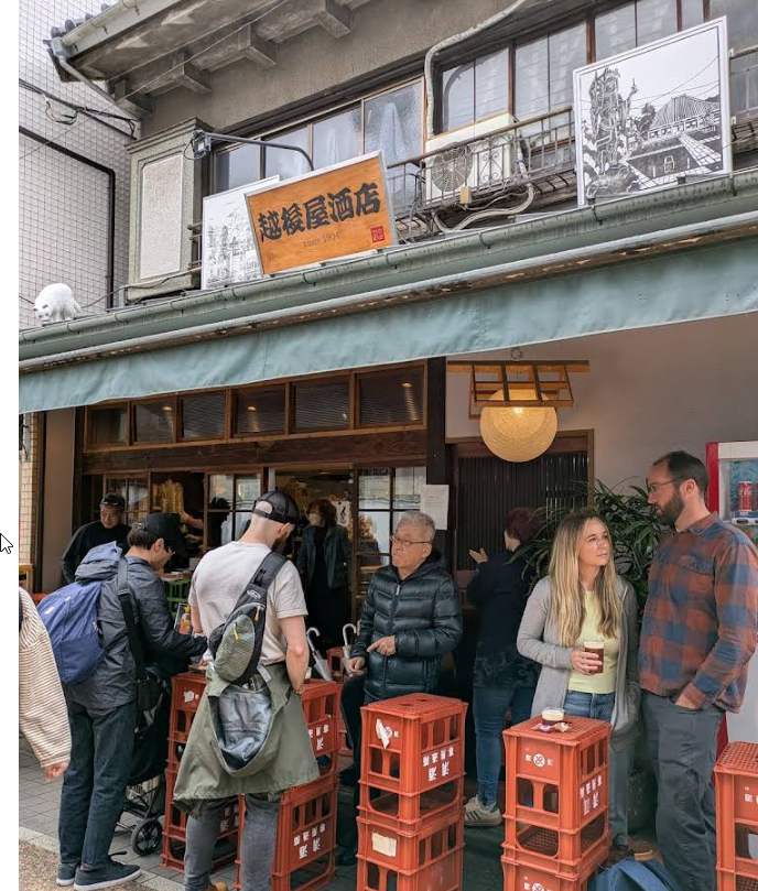 這家位在谷中銀座的【越後屋酒店】,不管是平日還是假日,門口永遠都有一群人站在紅色酒箱旁邊,邊喝邊聊,超級熱鬧!