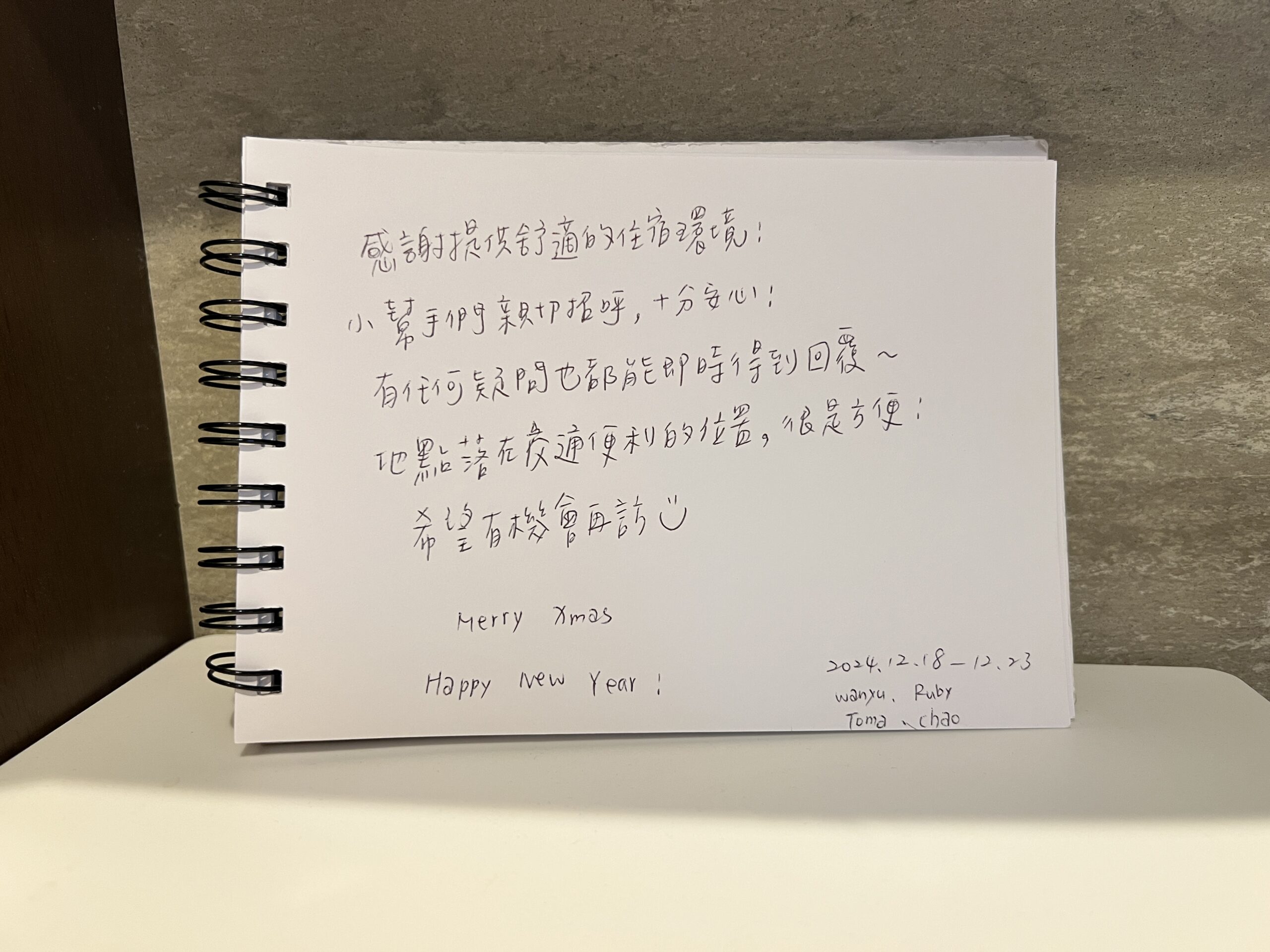 圖片中,旅客寫道:「感謝提供舒適的住宿環境!小幫手們都很棒,十分耐心!有任何疑問也都能即時得到回覆~地點就在交通便利的位置,很方便!希望有機會再訪 🙂 Merry Xmas Happy New Year!2024.12.18-12.23 」。