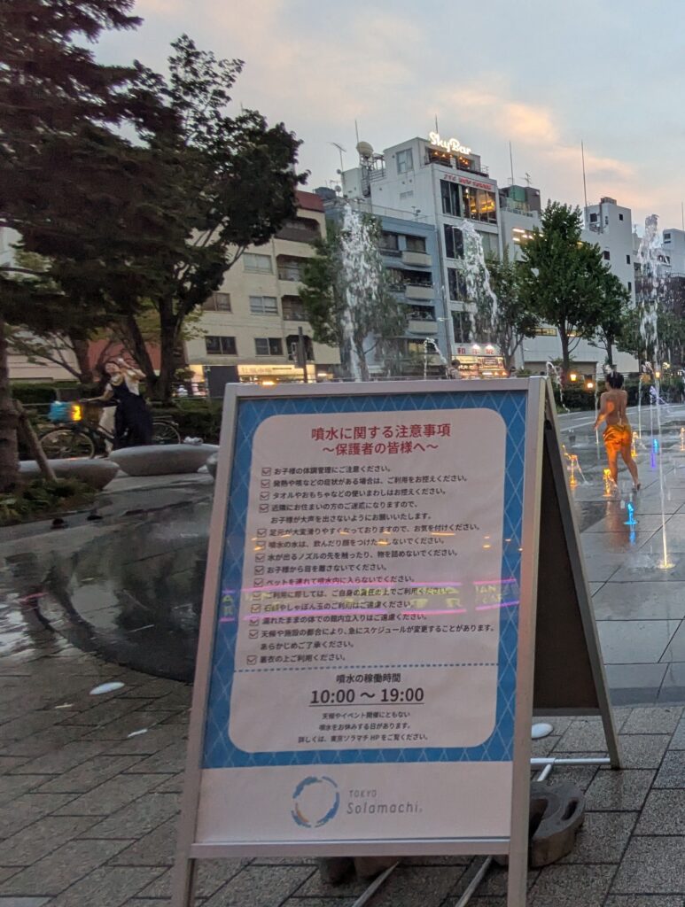 每天從 10:00~19:00,噴水廣場準時開放,隨著燈光與音樂變化,水柱時而高聳、時而低舞,帶來猶如表演般的視覺享受。孩子們在噴水中盡情奔跑、玩耍,開心的笑聲此起彼落;而大人們則可以在一旁欣賞這座與晴空塔呼應的「都市小樂園」,不論白天或夜晚都各有魅力。