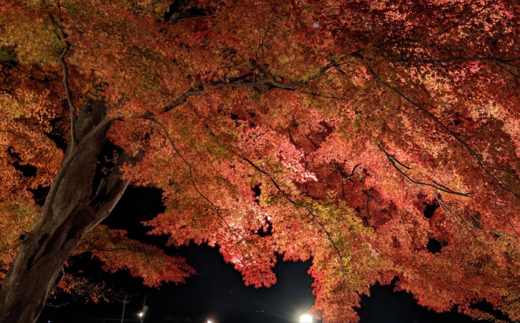 這幾張照片把 河口湖楓葉迴廊 的夜楓浪漫氣氛完全展現出來 🍁✨。滿滿的紅與金黃楓葉在燈光照映下閃耀,真的是秋天限定的夢幻場景。