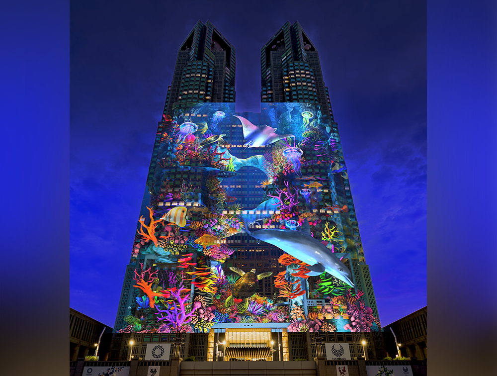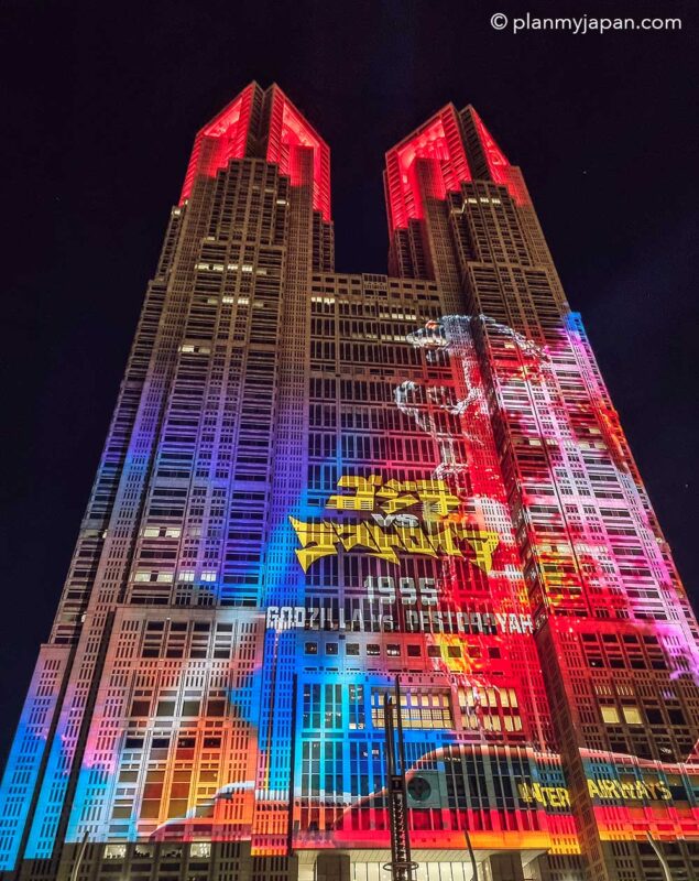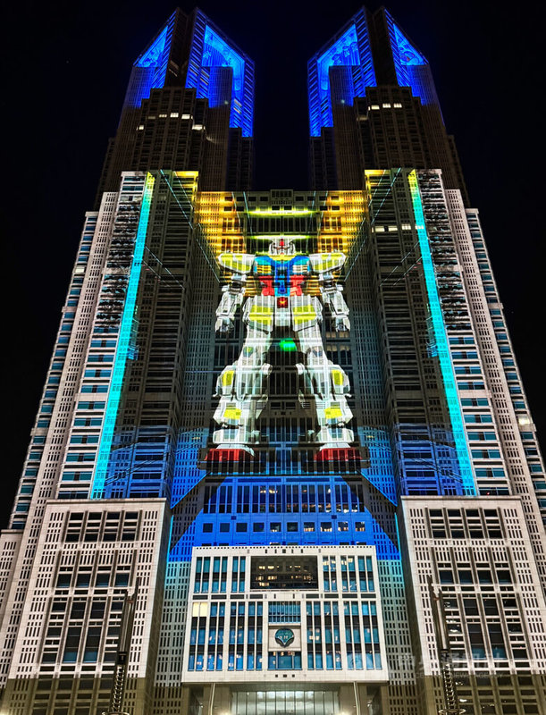 從【東京都廳】前的廣場抬頭一看,整棟大樓化身為巨型投影幕——哥吉拉、鋼彈、PAC-MAN,甚至是浮世繪大浪都在眼前活了起來![]()