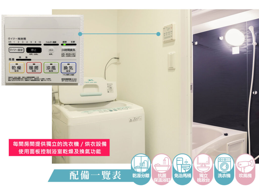 並備有日本品牌大風量吹風機,讓您有更舒適的洗澡體驗。